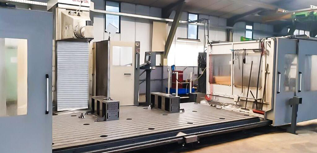 Verfahrwege x 4300 / Y 1500 / Z 1800, Tischbelastung 15t/m2 Tischabmessungen 5000 x 2500 mm, Werkzeugaufnahme SK 50 mit automatischem Schwenkkopf B-Achse 1° und C-Achse 2.5°